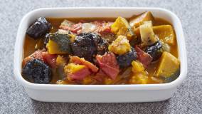夏野菜を炒めてから蒸し煮にする人気のラタトゥイユ。青じその風味が爽やかな和風アレンジです。なすやかぼちゃのおいしさがギュッと凝縮。