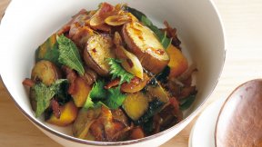 ミキサーいらずで手間なくつくれるビギナー向きのポタージュです。トッピングのベーコンの塩けが、かぼちゃの甘さのアクセントに。