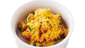 角切りにしたかぼちゃを柔らかくゆでてつぶし、サラダに。きゅうりのシャリシャリ感と、生クリームのコクでおいしさアップ!