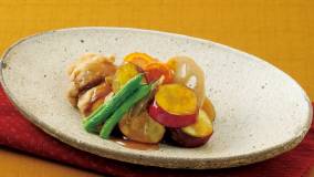 甘酢あんとの相性が抜群のさつまいもをはじめ、素揚げにした根菜が勢ぞろいの一品です。