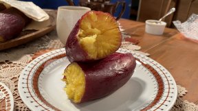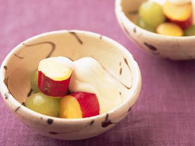 おやつにもなるさつまいものシロップ煮。豆腐のあえ衣をのせれば、和風の小鉢に変身です。
