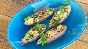 さつまいもを丸ごと蒸したら、中身をくりぬいてボートの形に。アーモンドやりんごも加えた食感も楽しいかわいいサラダです。