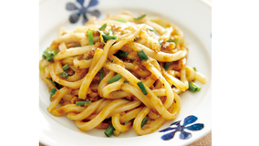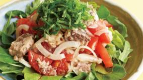 うまみたっぷりのさば缶は、汁ごと使ってパスタのソースに。たまねぎの甘みが、全体をマイルドにまとめてくれます。仕上げに加える青じその爽やかな香りがアクセントに。