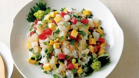 香川県の名産を使った新しいばらずしです。甘さを控えてさっぱりと。軽やかで食べやすい酢飯に、彩りよく並べた具材がアクセント。