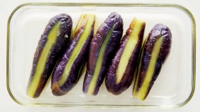 7~8分間蒸すだけで完成の「蒸しなす」。蒸しておけば、いろいろな料理にも使えて便利です。