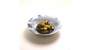 なすの古漬けと小えびを炊いた、大阪泉州(せんしゅう)の郷土料理「じゃこごうこ」をアレンジして。なすは相性のいい油で揚げて甘みを引き出し、あんでまとめました。夏らしい彩りが食欲を誘います。
