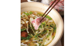 人気のぶりしゃぶを、梅仕立てでいただきます。ほんのり火の通ったぶりと野菜のシャッキリ感がたまりませんよ。