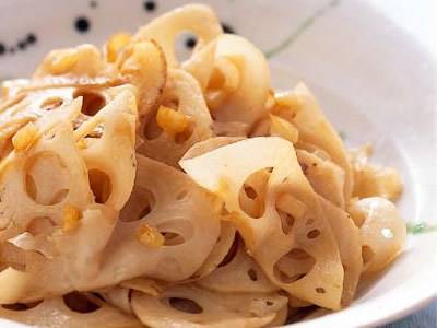 簡単にできて、驚くほどおいしい炒め物。シャッキリれんこんに、パンチのきいたにんにくみそがからみます。