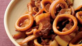 皮付きのまま輪切りにしたいかを冷凍します。冷凍なので高温で煮る時間が短く、柔らかな食感になります。