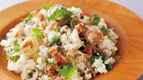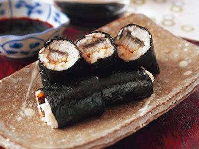 器にご飯、具を盛って、合わせ酢を回しかけてあえる、カツ代流かけ回しずし。うなぎの代わりに小さめの焼きアナゴでもおいしい。