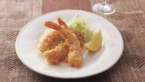 ガリガリしたコーンフレークスを衣にしたえびカツを、冷たいトマトサラダをソースにしてからめて食べると「すっきり」と「ガリガリ」で、楽しい。