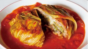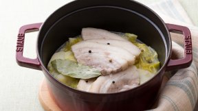 少量の水と野菜から出る水分で、ふっくらと蒸し煮に。手羽元のうまみが、柔らかなキャベツにじんわりとしみ込みます。