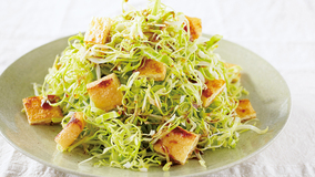 ちぎった春キャベツにアツアツの油をジュッとかけると、コクが出て、豆苗の風味も際立ちます。しょうゆ味のツナサラダで、キャベツがモリモリ食べられます。