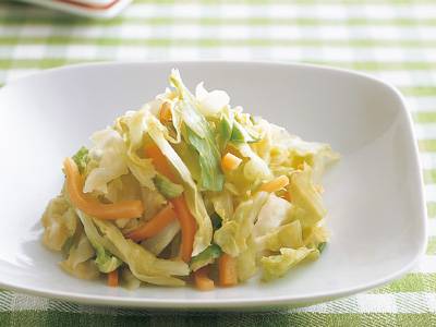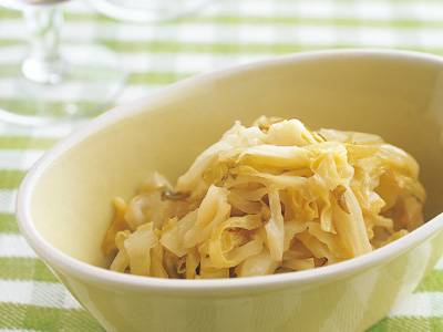 キャベツをドイツのザワークラウト風にさっぱりと酸味をきかせて蒸します。揚げ物によく合う一品です。