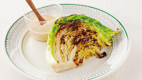 キャベツを塊のままこんがりと焼きつけた、豪快な一皿。明太子とチーズのとろ~り濃厚なソースをたっぷりつけて召し上がれ!
