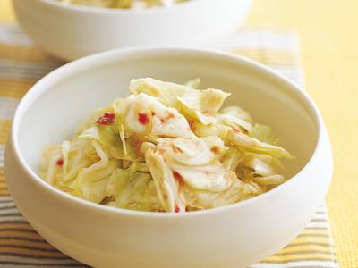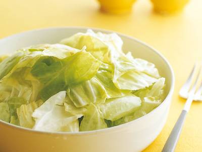 塩、こしょう、酢、オリーブ油だけであえて、キャベツの甘みを引き立てます。やわらかな口当たり、フレッシュなおいしさを楽しみましょう!