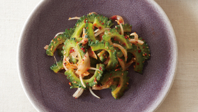 ゴーヤーの苦みをそのまま生かして、みょうがと青じそと合わせ、酸味のきいた梅酢じょうゆで。はし休めにちょうどいい一品です。