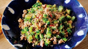 ビタミンたっぷりの2種類の野菜を豆腐に合わせて、ごま油と削り節でコクを出します。