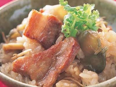 豚肉はやや厚めに切っても圧力なべ効果で柔らかく仕上がります。ボリューム満点のおこわです。