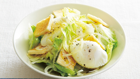 コンソメねぎドレッシングが味の決め手!温泉卵がレタスに程よくからんだやさしい味わい。