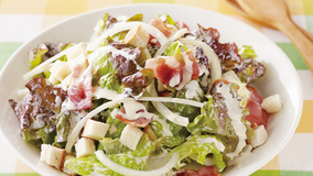 電子レンジでクルトンも簡単!カリカリベーコンもできちゃいます。まろやかなソースをからめたら、人気のサラダができ上がり!