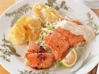 メインのサーモンのハーブ焼きと、付け合わせのスイートポテトのグラタンを同時に焼けば、どちらもできたてで熱いうちにテーブルに並べられます。