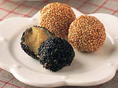 さつまいもで作る揚げボール。生地にシナモンを混ぜたり、ごまの代わりにスライスアーモンドをまぶしてバリエーションを楽しんで。