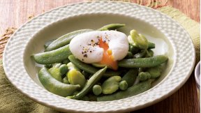 フレッシュな青豆のやさしい甘さがうれしい一品。卵をトロッと割っていただきます。