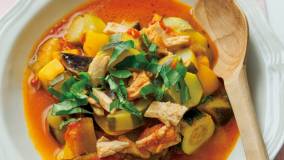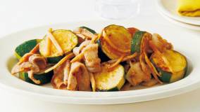 鶏むね肉とズッキーニを焼きつけてから蒸し焼きにして、早く火を通します。甘口カレーのような、ホッとする味わいです。