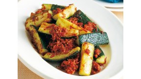 あっさりとした味わいのズッキーニとかじきに、アンチョビのうまみとにんにくの風味がよくマッチします。