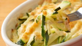 卵とチーズをのせてオーブン焼きにして仕上げる、アツアツのおかずスープです。柔らかく煮込んだズッキーニに、ほかの具材のうまみもしみて豊かに。