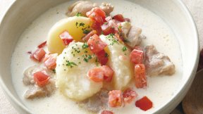 ホクホクッとしたじゃがいもに、鶏肉のうまみとクリームのやさしいコクがしみ込みます。トマトの酸味で軽やかさもプラス。心がホッとするおいしさです。