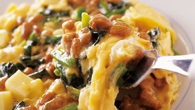 チーズとごまでコクを、青じそで香りを出し、トマトソースでさっぱり仕上げます。まだ早いかな?くらいで卵を火からはずし、半熟状でのせるのがポイントですよ。