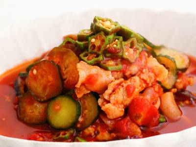 野菜の水分だけでじっくり蒸し煮する、夏には欠かせないメニュー。そのままでも冷やしてもおいしい。