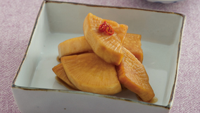 厚めにむいた大根の皮でもう一品。柚子(ゆず)の爽やかさと、ピリッとしたスパイス感が大根の辛みとベストマッチ!ポリポリとした食感も楽しい漬物です。
