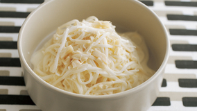 マヨネーズと帆立てのコクでうまみ満点。長さ、太さのそろったせん切りの食感もポイントです。