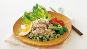デリの人気素材、アボカドが主役!ドレッシングであえた水菜とねぎに、柔らかく仕上げた卵とアボカドをソースのようにからめてどうぞ。