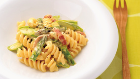 アスパラガスがたっぷり入った春らしい一品です。アスパラガスの存在感を出すために、パスタはロングではなくショートを使用しました。