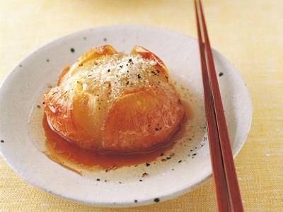 みずみずしい新たまねぎをじっくりオーブンで焼くと、甘くてトロッとした黄金色のたまねぎに。