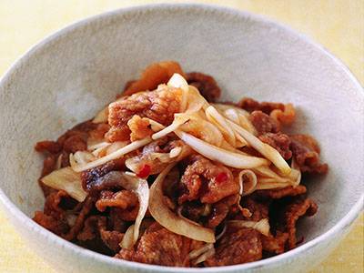 新たまねぎ、豚肉、にんにく、にらでスタミナたっぷり、ご飯がすすむ甘辛味の一品です。