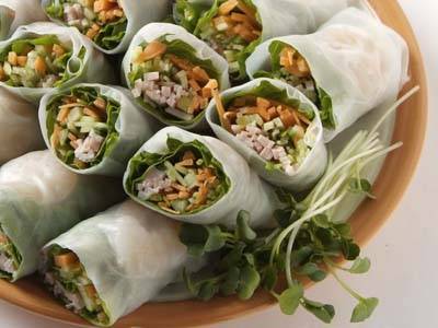揚げるのではなく、ごま油をぬって焼いた春巻。具も炒めないので、油の量をグンと減らせます。