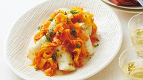 リボン状にしたにんじんは、柔らかく、独特の食感になり、にんにくやアンチョビともよくなじみます。