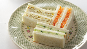3種の具をはさんだ、彩りよくふんわり軽やかなサンドイッチ。にんじんときゅうりは、口当たりの邪魔をしないようごく薄くスライスするのがポイントです!