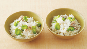 ホクホクのそら豆とたいの上品なうまみが魅力の炊き込みご飯です。薄皮をむいたそら豆と、下味をつけたたいをのせて炊くだけ。