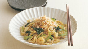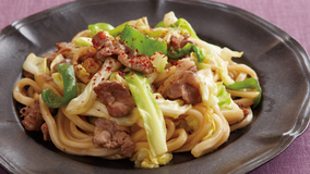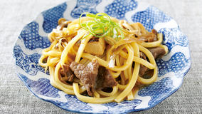 焼きそば感覚の焼きうどん。牛肉に下味をつけ、仕上げはオイスターソースだけのあっさり味に仕上げました。