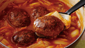 ハンバーグをたっぷりの白菜といっしょに煮込めば、白菜から出る水分で、ちょうどよいとろみに。