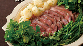 牛ヒレ肉を2分間、ミネストローネのスープに沈めてボイルします。「おいしいを楽しむ」お料理です。