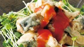 鶏肉は皮を焼いて香ばしさを出してから、酒蒸しにします。その蒸し汁であえたひじきの上に並べ、レモンの酸味も爽やかなにんじんソースをかけます。まずは目で楽しみ、全体を混ぜていただきましょう。