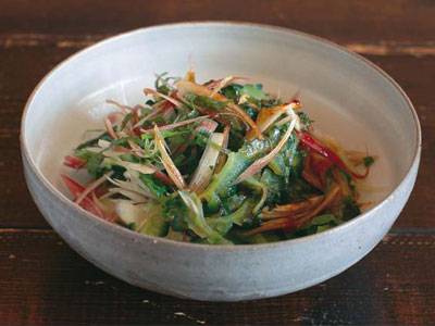 ゴーヤーの苦みをそのまま生かして、みょうがと青じそと合わせ、酸味のきいた梅酢じょうゆで。はし休めにちょうどいい一品です。