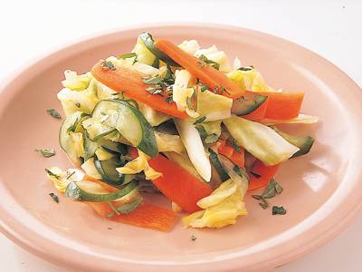 野菜だけのさっぱりとした酢の物。食感の組み合わせが楽しく、彩りも華やかな、夏らしい一品。